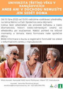 Srdečně vás zveme na cyklus vzdělávacích přednášek „Němci a Češi: Společná cesta dějinami“, který začne 15. října 2025 ve 13:00 v kanceláři MAS Horní Pomoraví (Hlavní 137, Hanušovice). Čeká vás 6 zajímavých přednášek o bohaté a často dramatické historii česko-německých vztahů od středověku až po současnost. Získáte nový pohled na klíčové momenty a události, které formovaly naše společné dějiny.